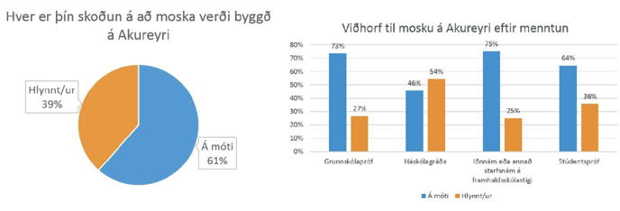 Árið 2015 var afstaða Akureyringa til mosku könnuð og voru 61% Akureyringa á móti því að byggð yrði moska. 39% voru því fylgjandi. Athygli vakti með tilliti til menntunar að einungis hjá háskólamenntuðu fólki var meirihluti fyrir byggingu mosku. 75% iðnaðarmanna og 73% þeirra með grunnskólapróf voru andvígir mosku. Hjá stúdentum var andstaðan 64%. Hjá fólki með háskólagráðu brá hins vegar svo við að 54% voru fylgjandi byggingu mosku á Akureyri en 46% á móti.
