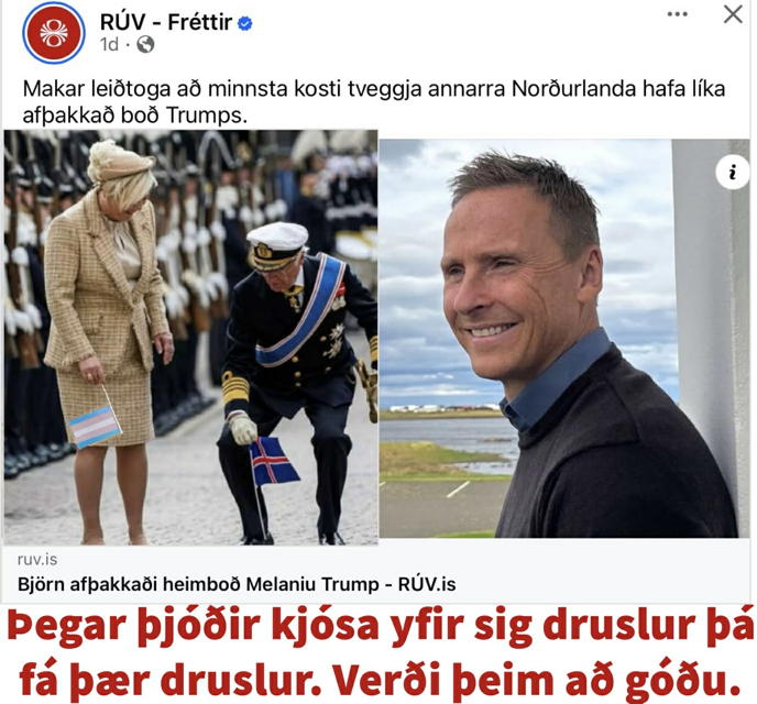 Ekki virðast nein takmörk fyrir því hversu lágt forsetahjónin á Bessastöðum eru reiðubúin að leggjast í vókaðri aðgerðastefnu og árásum gegn Bandaríkjastjórn og þá sérstaklega forseta Bandaríkjanna Donald Trump. Halla Tómasdóttir dreifir lygum spældra vinstrimanna gegn Donald Trump vegna þess að Bandaríkjastjórn segir sannleikanum um að kynin séu bara tvö: Karl og Kona. Núna er það nýjasta að forsetamakinn Björn Skúlason afþakkaði heiðursboð Melania Trump um átak fyrir eflingu persónulegs þroska barna í stafrænum heimi.