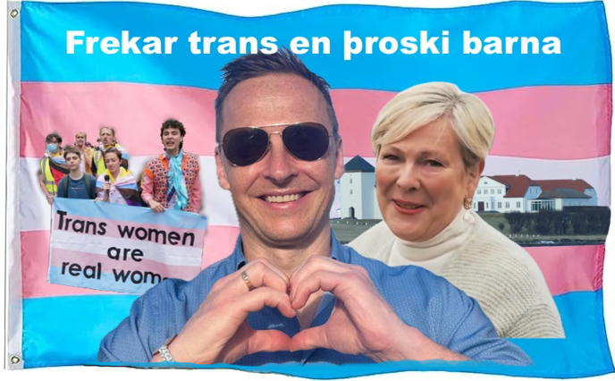 Hér er meme grín sem Íris Erlingsdóttir, fjölmiðlafræðingur, hefur gert. Til að sýna forgangsröðun íslenska forsetans er Halla látin halda á transfána á meðan sænski kóngurinn beygir sig niður eftir þeim íslenska sem forsetinn gat ekki haldið á. Til hægri forsetamakinn Björn Skúlason sem sýnir vók dónaskap með höfnun á heiðursboði Hvíta hússins.