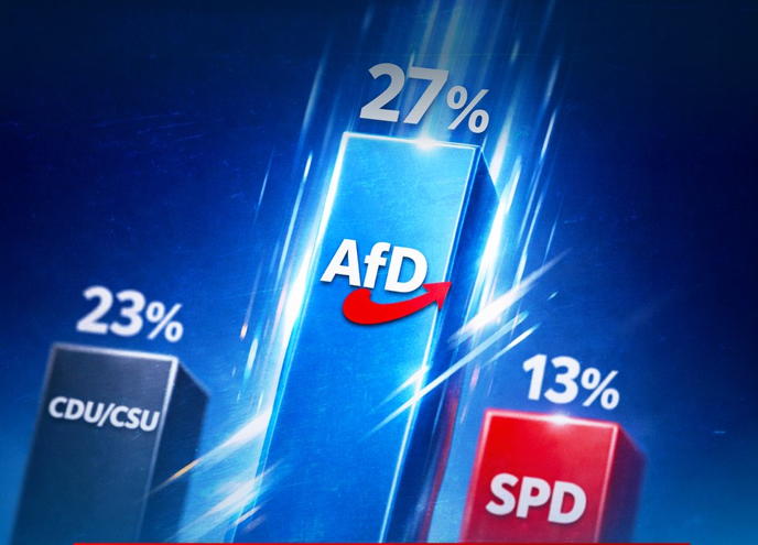 Valkostur fyrir Þýskaland, Alternative für Deutschland (AfD) eykur forskot sitt í skoðanakönnunum í Þýskalandi. Ný könnun sýnir að flokkurinn er nú greinilega á undan Kristdemókrötum CDU og CSU. En þrátt fyrir að AfD sé nú klárlega stærsti flokkur Þýskalands neita hinir flokkarnir enn að hafa nokkuð samráð við áskorandann.