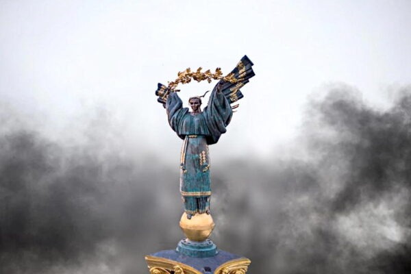 Sjálfstæðisgyðjan í Kænugarði umvafin reyk og nálykt vígvallarins (samsett mynd)….