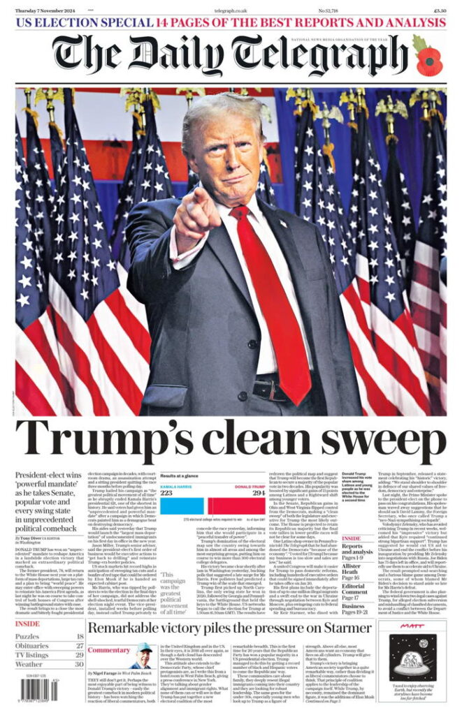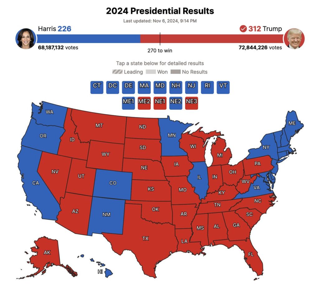 Þegar þessi orð eru skrifuð kl 11:10 þá er staðan þessi: Trump hefur tryggt sér 312 kjörmenn af 538 en Kamala hefur 226 kjörmenn. 270 kjörmenn þarf til að verða kjörinn forseti Bandaríkjanna. Trump hefur einnig góðan meirihluta atkvæða 4,7 milljónum fleiri atkvæði en Kamala. Repúblikanar hafa einnig tryggt meirihlutann í öldungadeildinni og fulltrúadeildinni. Skýrari geta skilaboð hins almenna Bandaríkjamanns ekki verið. Sigur Trumps varð eins og repúblikanar unnu að: To big to rig eða of stór til að hægt væri að svindla.