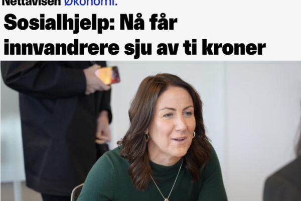 Tonje Brenna atvinnu- og innflytjendaráðherra Noregs (skjáskot Netavisen). Hlutfall félagslegrar…