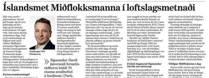Gulli Græni, loftslagsráðherra Íslands, fer í loftköstum í loftslagsmálum í grein í Morgunblaðinu í dag, 23. nóvember. Hann fer á hátt flug í árás á Miðflokkinn sem er greinilega óþægilegasti andstæðingur hans í yfirstandandi kosningum. Hann kennir Miðflokknum um að eiga Íslandsmet í loftslagsmetnaði og vitnar í aðkomu formanns Miðflokksins að skuldbindingum Íslands í Parísarsáttmálanum m.fl. Gulli Græni er svo blindaður af ljósadýrð Sigmundar Davíðs að hann finnur engin orð um yfirstandandi loftslagsráðstefnu COP29 eða ránstillögur SÞ á Vesturlönd. Gulli Græni hrósar sér af því að hann hafi „lækkað” útgjöld til loftslagsmála samtímis sem hann hreykir sér af árangri þess svikamyllukerfis sem hinn loftslagsmetnaðarfulli Sigmundar Davíð dró til Íslands og skilar enn sem komið er arði af sölu orkuaflátsbréfa sem notuð eru til að búa til falsfréttir um notkun kolarorku við rafmagnsframleiðslu erlendis. Hver á að skilja þvílíkt bull, að stór hluti rafmagns á Íslandi sé framleiddur með kjarnorku og olíu?