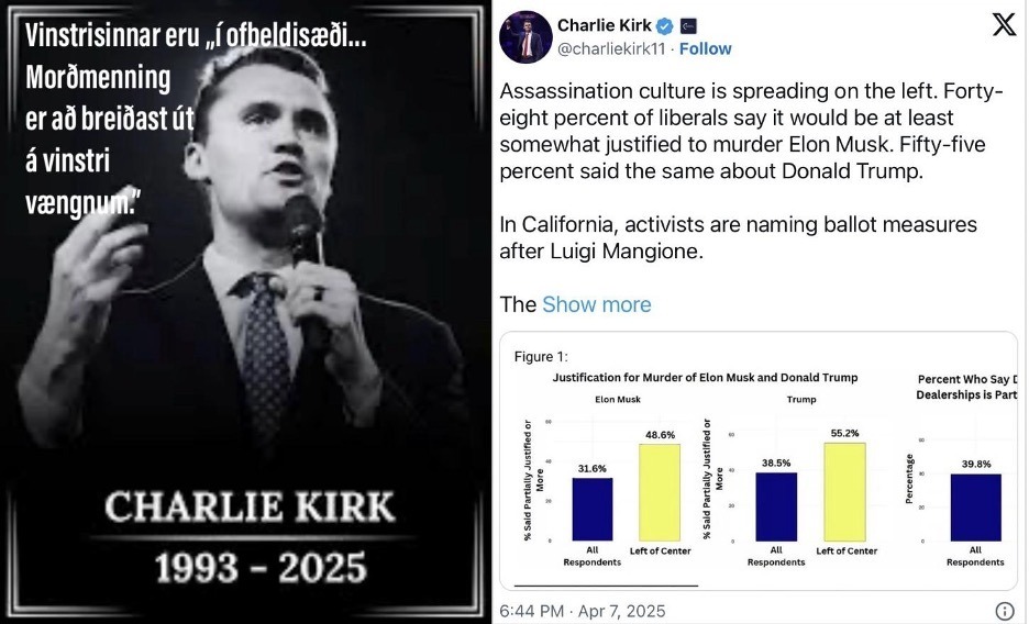Hvað halda Demókratar að sé „nauðsynlegt“? Nú, kannski, eins og formaður flokksins sagði, að koma með hníf í „hnífastríð“, Demókrataflokksins Ken Martin. Eins og Kirk benti á fyrr á árinu, segja 49% vinstrimanna að það sé að minnsta kosti réttlætanlegt að myrða Elon Musk, og 55% segja slíkt hið sama um Donald Trump Bandaríkjaforseta.