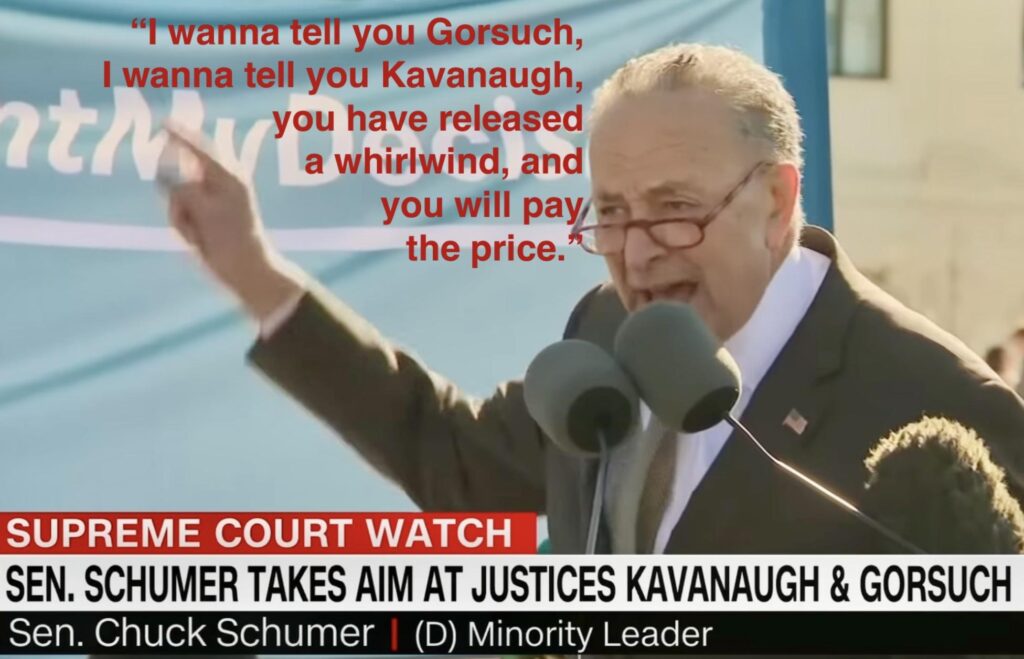 Einn helsti leiðtogi Demókrata, Chuck Schumer (D-NY), hótaði dómurum Hæstaréttar árið 2020 ef þeir dæmdu ekki „rétt“ varðandi fóstureyðingar og tveimur árum síðar fór maður vopnaður byssu til heimilis hæstaréttardómarans Brett Kavanaugh í þeim tilgangi að myrða hann.