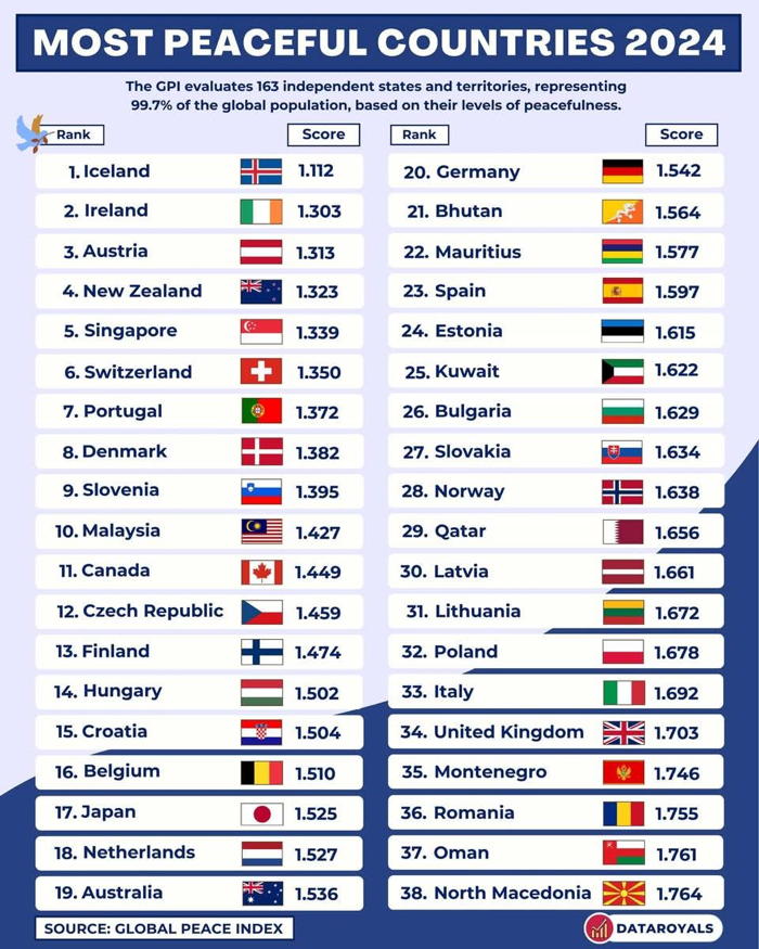 Þrátt fyrir að Ísland „hafi farið í stríð” með lokun sendiráðs Íslands í Moskvu og slit á stjórnmálasambandi við Rússland og og þrátt fyrir að dæla peningum skattgreiðenda á Íslandi að þeim forspurðum í vopn til Úkraínu, þá er Ísland samt sem áður talin friðsamasta þjóð í heimi 2024 samkvæmt Alþjóðlega friðarmælingum Global Peace Index (sjá pdf að neðan). Það er kannski samtímis mælikvarði á vaxandi ófriðarástand í heiminum.
