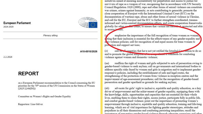 Samkvæmt pakkanum krefst ESB-þingið „fullrar viðurkenningar á transkonum sem konum“ innan ramma forgangsverkefnis ESB fyrir réttindum kvenna og jafnrétti kynjanna á ráðstefnu Sameinuðu þjóðanna. Í textanum er einnig vísað til aðgangs að þjónustu sem miðar að því að vernda konur gegn ofbeldi eins og kvennaskjólum.