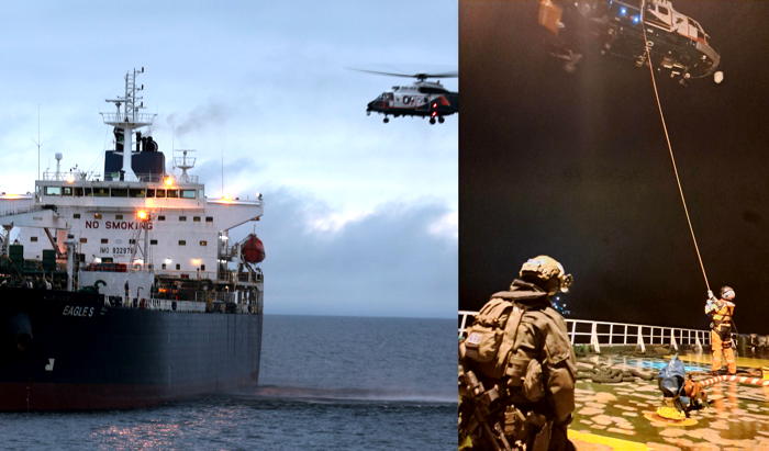 Eagle S lagði upp frá hafnarborginni Ust-Luga í Rússlandi sama morgun. Finnska strandgæslan fór á móti skipinu á alþjóðlegu hafsvæði og skipaði því inn í finnska landhelgi. Þegar þangað var komið var finnskum sérsveitarlögreglumönnum halað um borð úr þyrlu í skipið við dramatískar aðstæður.