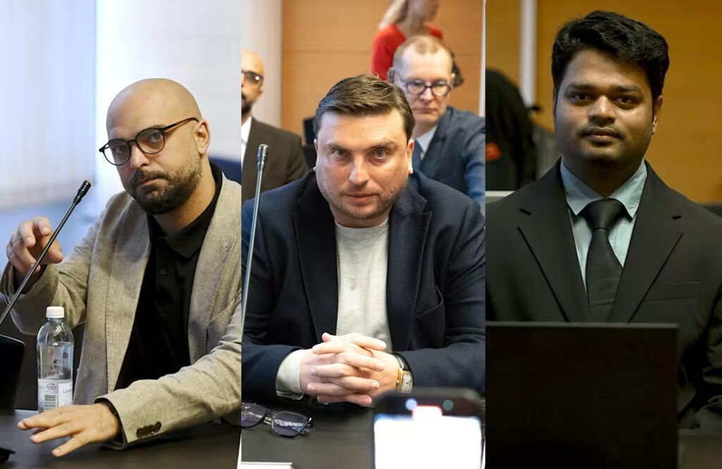 Hinir þrír ákærðu: Davit Vadatchkoria, skipstjóri og stýrimennirnir tveir: Robert Egizaryan och Santosh Kumar Chaurasia. (Skjáskot Yle).