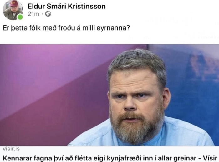 Skiljanlegt er að Eldur spyrji. Að „flétta“ eigi glórulausum fjarstæðum inn í námsefni grunnskóla er frétt sem hver heilvita maður bregst við með hryllingi. En á Íslandi er framboð á heilvita einstaklingum í algjöru lágmarki, eins og sést af fréttinni, sem einnig greinir frá því að „KÍ [hafi] orðið áþreifanlega vart við áhrif [kynbundins ofbeldis] faraldurs meðal síns félagsfólks.“ „Frétta“maður Vísis, Jakob Bjarnar, sér þó enga ástæðu til að spyrja nánar út í þessa alvarlegu staðhæfingu.