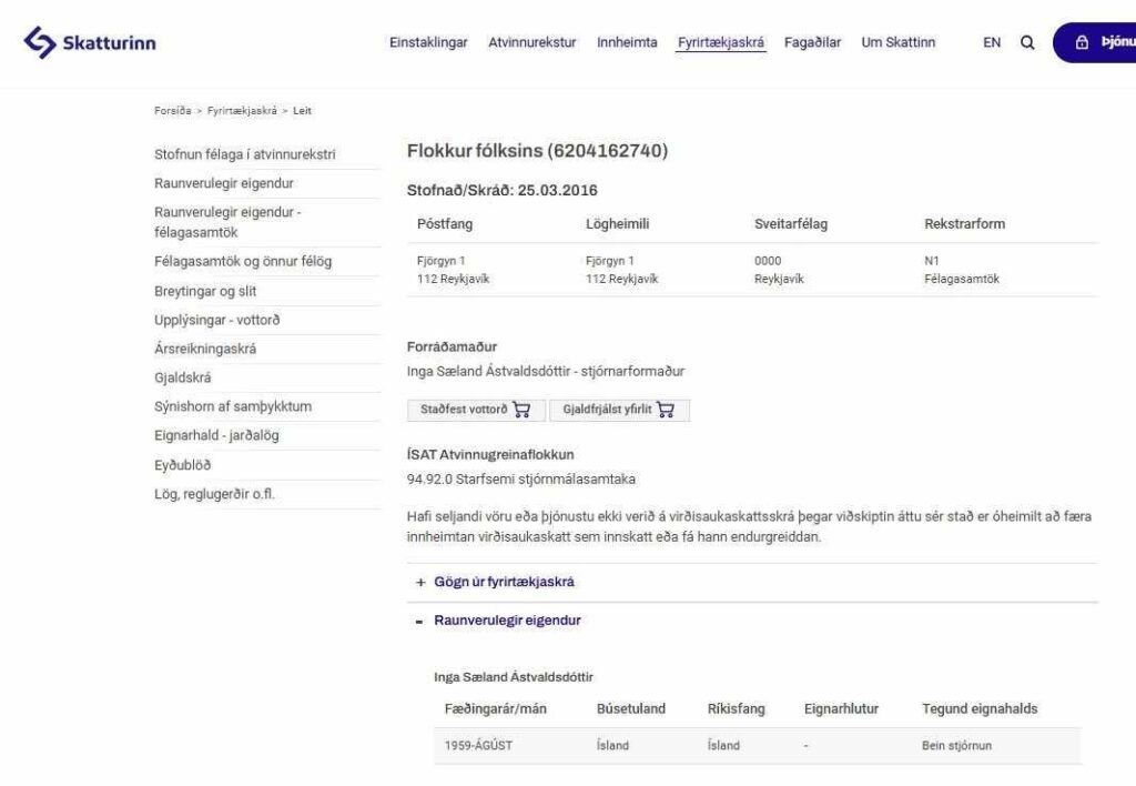 Öryrkinn Inga Sæland Ástvaldsdóttir er stjórnarformaður og prókúruhafi félags í atvinnurekstri skráð af Skattinum sem Flokkur fólksins 620416-6740 Fjörgyn 1, 112 Rvk. Félagið mun hafa verið stofnað í eldhúsi stjórnarformanns, einstæður öryrki en er nú kröftug ráðstýra. Allar götur frá 2021 hefur FF fengið úthlutað hundruð milljónum af skattfé án þess að uppfylla skilyrði laga; 240 milljónir króna frá ríki og sveitarfélögum árin 2022, 2023 og 2024. “Þetta er bara formgalli,“ segir I.S. Ástvaldsdóttir, ekkert að sjá, vísaði spurningum blaðamanns á bug og gekk á braut. Enginn landsfundur frá 2019. Félagið var stofnað 2016. Hvað gerðist fyrir 2021? Rannsakar Ríkisenduskoðun til ársins 2016? Öryrkjar og lífeyrisþegar verða að skila hverri ofgreiddri krónu en ekki I.S Ástvaldsdóttir sem kveðst fá upp í kok þegar stórt er stolið. Nú er I.S.Ástvaldsdóttir að selja Íslandsbanka, hefur kokgleypt bókun 35 og skóflustunga tekin að Borgarlínu. Hún lofaði öryrkjum og lífeyrisþegum 450 þúsund króna skatta- og skerðingalausum lámarkslaunum. Fær I.S Ástvaldsdóttir upp í kok fyrir að ljúga stórt?