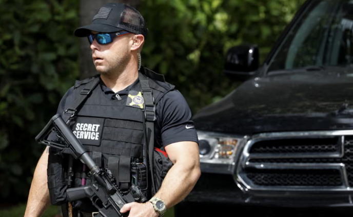Vopnaður vörður við heimili Bandaríkjaforseta Mar-a-Lago, Flórída, þegar FBI gerði áhlaup til að rannsaka „stolin skjöl” heima hjá Trump. Þeir fundu engin slík og verið að rannsaka tengsl Biden og Hvíta hússins við málið.