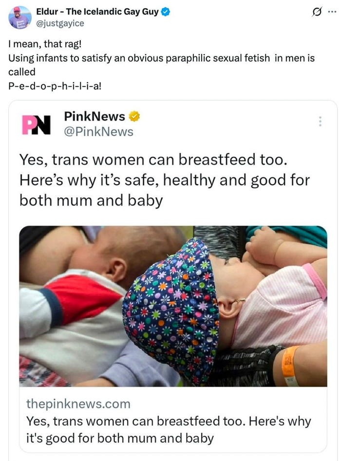Þó að sumir gætu hikað við ásökunina um barnaníð í tísti Elds, þá er erfitt að skoða myndir af körlum með barn á brjósti án þess að komast að þeirri niðurstöðu, að kynferðisleg nautn (fetish) sé tekin fram yfir velferð barnanna. Það er varla róttæk afstaða að álykta að þetta sé tegund af barnaníði.
