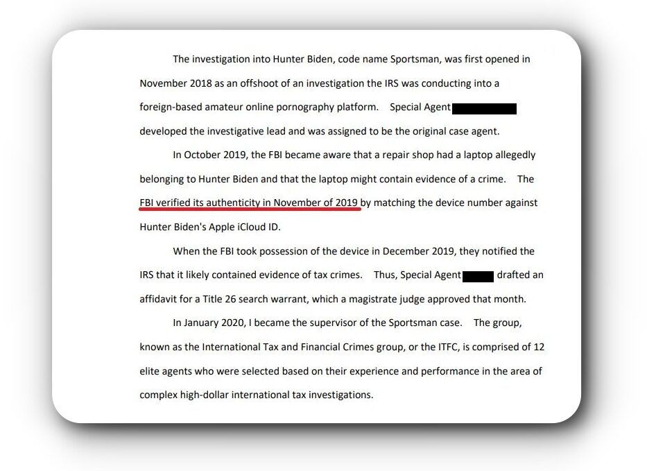 „FBI varð kunnugt um í október 2019 að viðgerðarverkstæði væri með fartölvu sem sögð var tilheyra Hunter Biden og að fartölvan gæti innihaldið vísbendingar um glæp. FBI staðfesti áreiðanleika tölvunnar í nóvember 2019 með því að bera saman tækisnúmerið við Apple auðkenni Hunter Bidens.“