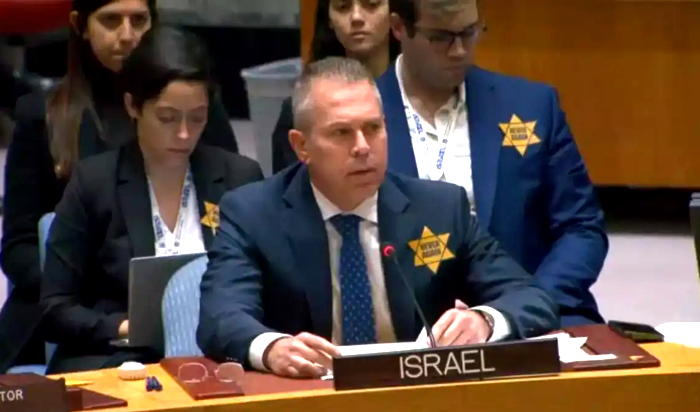 Sendinefnd Ísrael hjá SÞ bar Davíðsstjörnuna eftir hryðjuverkaárásir Hamas á Ísrael 7. október 2023