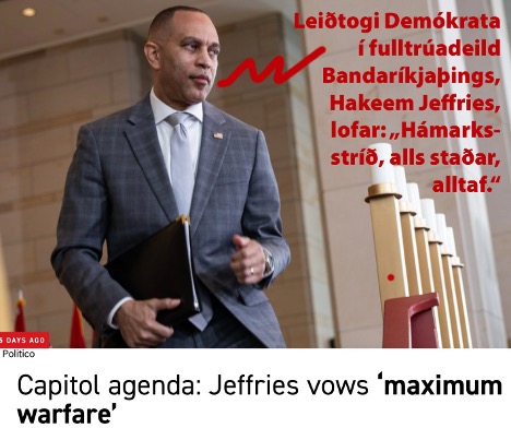 Þetta kemur ekki á óvart eftir margra ára innrætingu leiðtoga Demókrata og vinstrisinnaðra álitsgjafa sem stöðugt kalla þá sem þeim eru ósammála fasista og rasista Donald Trump nasista og Hitler. Heilaþvottur virkar. Nýjasta slagorð Demókrata og leiðtoga þeirra í fulltrúadeild Bandaríkjaþings, Hakeem Jeffries, er: „Hámarksstríð, alls staðar, alltaf.“ (Þeir hefðu getað sagt „hámarksandstaða“ eða „hámarksandóf,” en greinilega var „stríð” betra. Óneitanlega er kaldhæðnislegt að Demókratar vilja heyja „hámarksstríð“ gegn forseta Bandaríkjanna og pólitískum andstæðingum sínum á þingi, en ekki gegn íranska stjórnkerfinu).