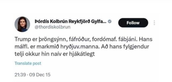 “Trump er þröngsýnn, fáfróður, fordómafullur fábjáni,“ sagði Þórdís Reykás Gylfadóttir utanríkisráðherra 9. desember 2015. Þessi kona hefur hervætt Ísland og leikið lykilhlutverk að þjóðin er í stríði við Rússa. Forsetanefnan Halla Tómasdóttir fulltrúi Wefaranna í Davos sagði í september 2016 “… að hræðilegt yrði ef Trump yrði kjörinn.“ Halla hefur ekki óskað nýkjörnum forseta Bandaríkjanna til hamingju þó bæði Bjarni Ben og Þórdís Reykfjörð hafi gert það. Halla Tóm hefur um árabil þjónað BTeam Ted Branson vafasömum einkavin Jeff Epstein. Linda Baldvinsdóttir sérfræðingur í mannnlegum samskiptum kveður Ameríku hafa kosið “…orðljótan geðsjúkan glæpamann.“ Konan rekur fyrirtæki sem hún kallar Manngildi. Hún kveðst sækja námskeið til að sigrast á hindrunum lífsins.