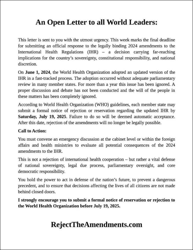 Á myndskeiðinu hér að neðan ræða þeir Dr. John Campell og James Roguski málið. Þeir senda frá sér VIÐVÖRUN TIL LEIÐTOGA HEIMS um fyrirætlanir WHO og hvetja alla til að hafna þessari gerræðislegu yfirtöku á sjálfsákvörðunarrétti fullvalda þjóða í eigin heilbrigðismálum. Roguski sendi frá sér eftirfarandi opið bréf til leiðtoga heims: