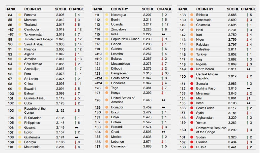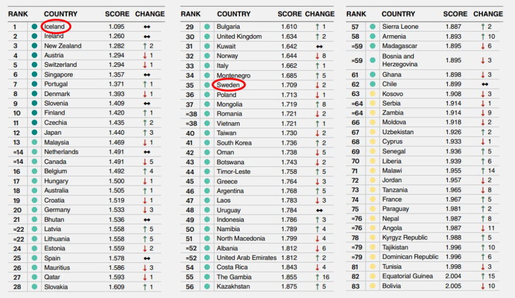 Á sama tíma heldur Ísland fyrsta sætinu sem friðsælasta land heims, þar á eftir koma nokkur Evrópulönd með þokkalega stjórn á innflytjendamálum. Danmörk og Finnland eru áfram í efstu tíu sætunum.