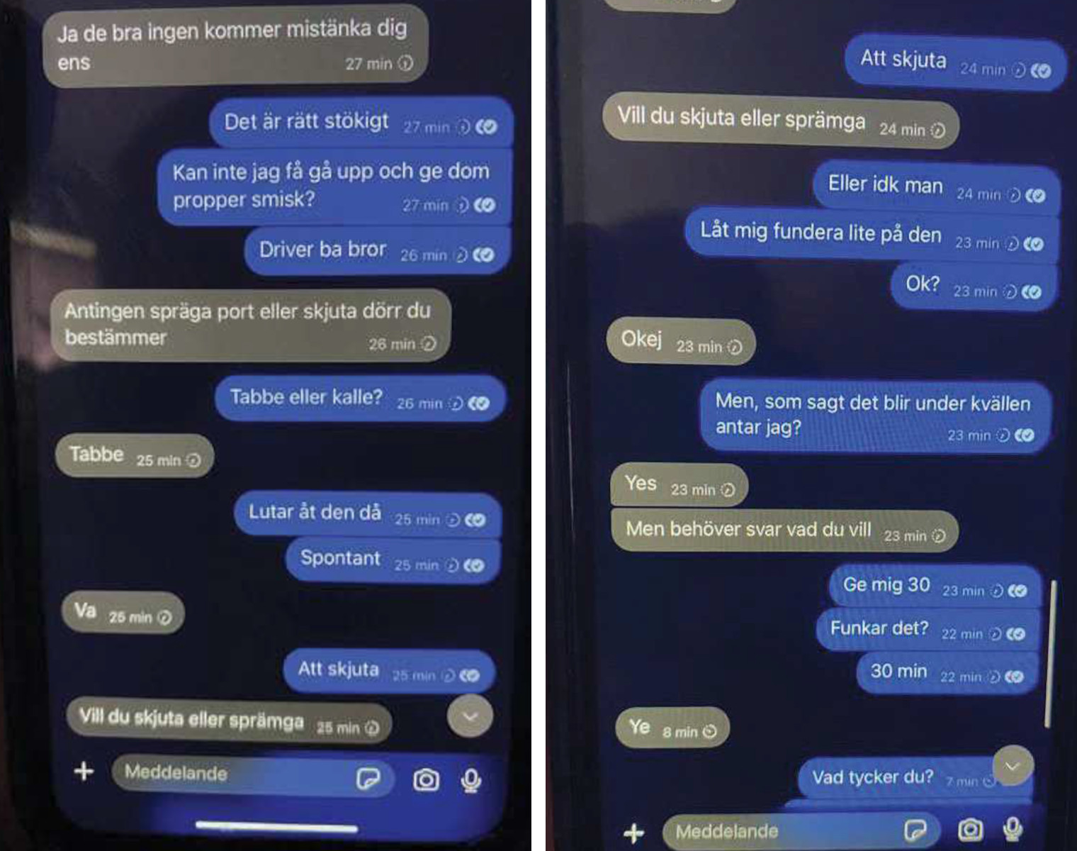 Af spjallsamskiptum sem lögreglurannsóknin sýndi virðist sem Johan Svensson hafi verið boðnar 20.000 sænskar krónur fyrir að sprengja eða skjóta útidyrahurð eða heimili. Eða 60.000 sænskar krónur fyrir samtals þrjú morð.
