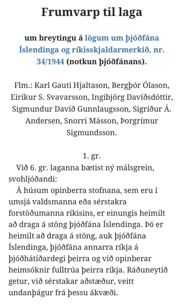Karl Gauti Hjaltason, þingmaður Miðflokksins, hefur lagt fram frumvarp ásamt fríðu föruneyti til að forma notkun íslenska þjóðfánans, þannig að börn læri að þekkja hann sem fána Íslands í stað annarra fána eins og transfánann. Sum yngri börn hafa haft transfánann í augnsýn alla daga frá fæðingu og halda að hann sé fáni Íslands og skilja einfaldlega ekki að íslenski fáninn okkar er fáni lýðveldisins. Þjóðólfur fagnar þessu frumvarpi sem full þörf er á og hvetur alþingi til að samþykkja það einróma. Frumvarpið má sjá hér að neðan: