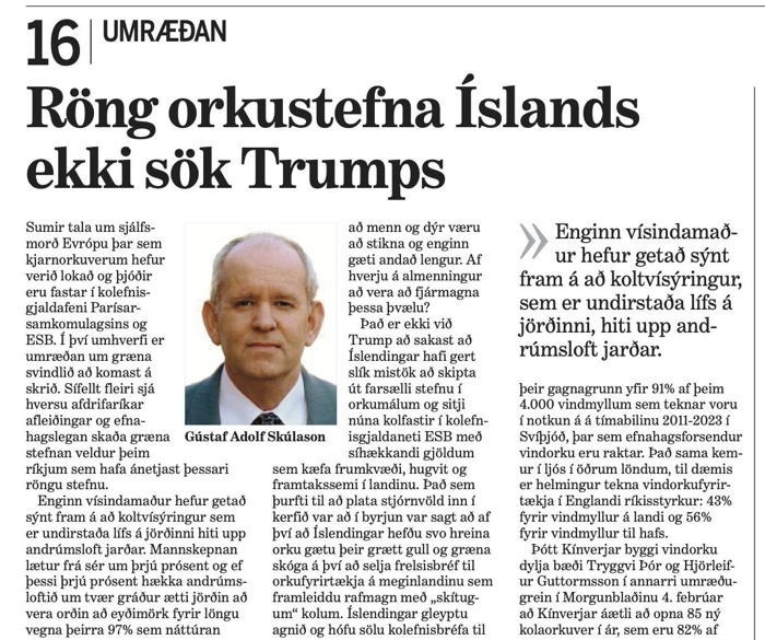 Samtímis birti Mbl. grein undirritaðs um ranga orkustefnu Íslands sem er á sömu nótum undir fyrirsögninni „Röng orkustefna Íslands ekki sök Trumps.“ Þar er bent á að enginn vísindamaður hefur getað sýnt fram á að koltvísýringur sem er undirstaða lífs á jörðinni hiti upp andrúmsloft jarðar. Mannskepnan lætur frá sér um þrjú prósent og ef þessi þrjú prósent hækka andrúmsloftið um tvær gráður, þá ætti jörðin að vera orðin að eyðimörk fyrir löngu, vegna þeirra 97% sem náttúran sjálf býr. Vitnað er í furðulega rafmagnsreikninga í Svíþjóð til notenda, þar sem rafmagnið er komið undir helming gjaldsins og fer minnkandi. Spáð er miklum hækkun á rafmagni til almennings og fyrirtækja innan ESB fram að 2030.