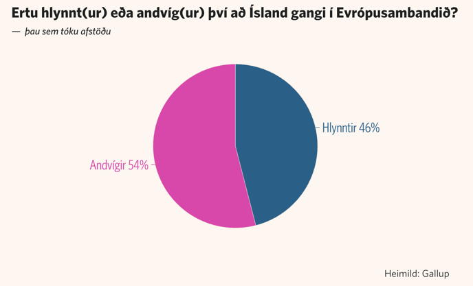 Þegar eingöngu er litið á þá sem tóku afstöðu til spurningarinnar er niðurstaðan sú að 54% eru andvígir inngöngu í ESB og 46% hlynnt.”