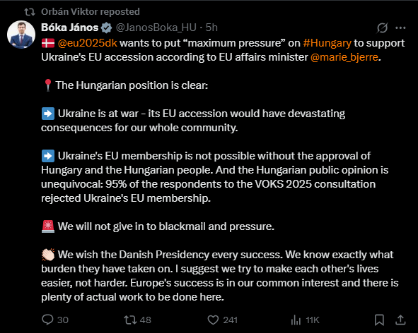Orbán er undir stöðugum þrýstingi frá hirðinni í Brussel og sjálfsmorðsvegferð ESB-glóbalista í flest öllum málum. Fáir þekkja betur en Ungverjar þær ógnir sem stafa af kommúnísku stórveldi. Í dag fjárkúgar ESB Ungverja um eina milljón evra daglega sem refsingu fyrir að galopna ekki landamærin og hleypa inn fólki frá Afríku og Miðausturlöndum. Orbán lýsti nýlega afstöðu Ungverja til kúgunartilburða ESB (sjá X aða neðan):