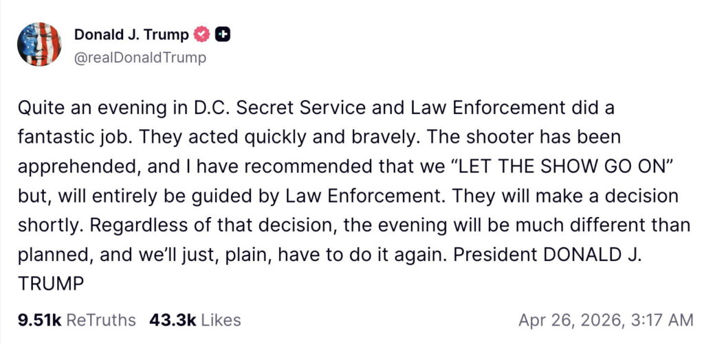 „Sérstakt kvöld í Washington. Leyniþjónustan og lögreglan stóðu sig frábærlega. Þeir brugðust hratt við og sýndu hugrekki. Skotmaðurinn hefur verið handtekinn og ég hef lagt til að við ‘LÁTUM SÝNINGUNA HALDA ÁFRAM’, en mun fylgja alfarið leiðbeiningum lögreglunnar. Þeir munu taka ákvörðun fljótlega. Óháð þeirri ákvörðun verður kvöldið mjög frábrugðið því sem áætlað var, og við verðum einfaldlega að gera þetta aftur síðar.“