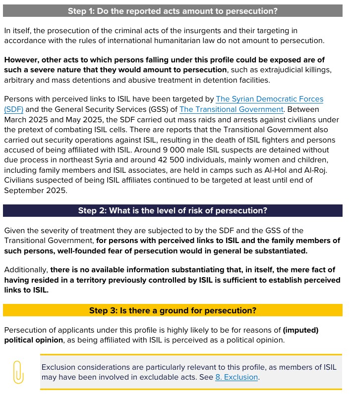 Samkvæmt EUAA eru tengsl við ÍSIS „stjórnmálaleg auðkenni sem í sjálfu sér geta veitt rétt til stöðu flóttamanns.“ Þar er einnig áréttað að einstaklingar með tengsl við ÍSIS hafa verið skotmörk Kúrdaforseta Sýrlensku lýðræðissveitanna (SDF) og öryggisþjónustu bráðabirgðastjórnarinnar (GSS) í Damaskus. Mat EUAA er ekki bindandi en flest lönd fylgja því.