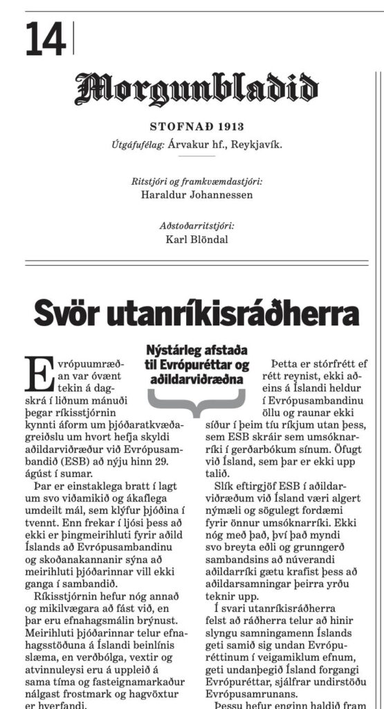 Í leiðara dagsins í Morgunblaðið er harðlega gagnrýnt hvernig staðið hefur verið að umræðu um mögulegar aðildarviðræður Íslands að Evrópusambandinu (ESB), sérstaklega í ljósi nýlegra ummæla utanríkisráðherra.
