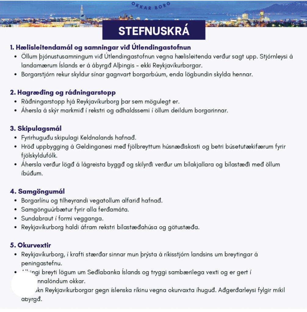 Baldur greinir frá sex punktum úr stefnuskrá hreyfingarinnar fyrir Reykvíkinga sem eru fyrstu brýnustu aðgerðir sem gera þarf til að snúa órum fyrri stjórna við sem þvinga bílastæðislausum íbúðum upp á fólk í von um að fá fallegri tölur fyrir Borgarlínuna sem er glatað verkefni frá byrjun.