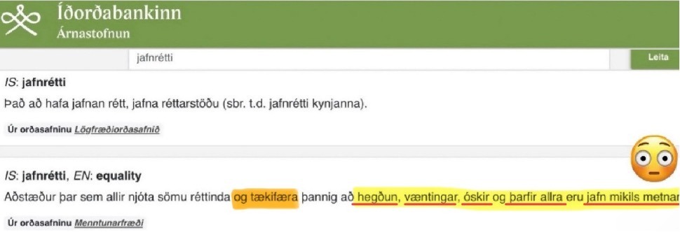 Ef mín „hegðun” er að ganga nakin niður Laugaveginn og mínar „óskir” og „þarfir” eru að láta fangelsa alla sem ekki eru mér sammála um að að ég hafi rétt til þess að ganga nakin niður Laugaveginn og að „jafnrétti” þýði ekki að “„hafa jafnan rétt” heldur að „hegðun, væntingar, óskir og þarfir allra eru jafn mikils metnar,” þá er það mitt „jafnrétti”? Er það rétt, Íðorðabanki?