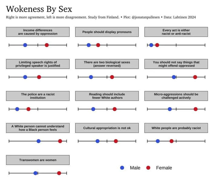 Konur eru umtalsvert „vókaðri“ en karlar í svörum sínum. Einnig kom í ljós að vinstri menn eru almennt kvíðafyllri. Fólk sem studdi vinstri flokka og kvenkyns háskólanemar í félags-, menntunar- og hugvísindum, sem og fólk af „öðru“ kyni, studdu vókið einna mest (sjá grafið að neðan):
