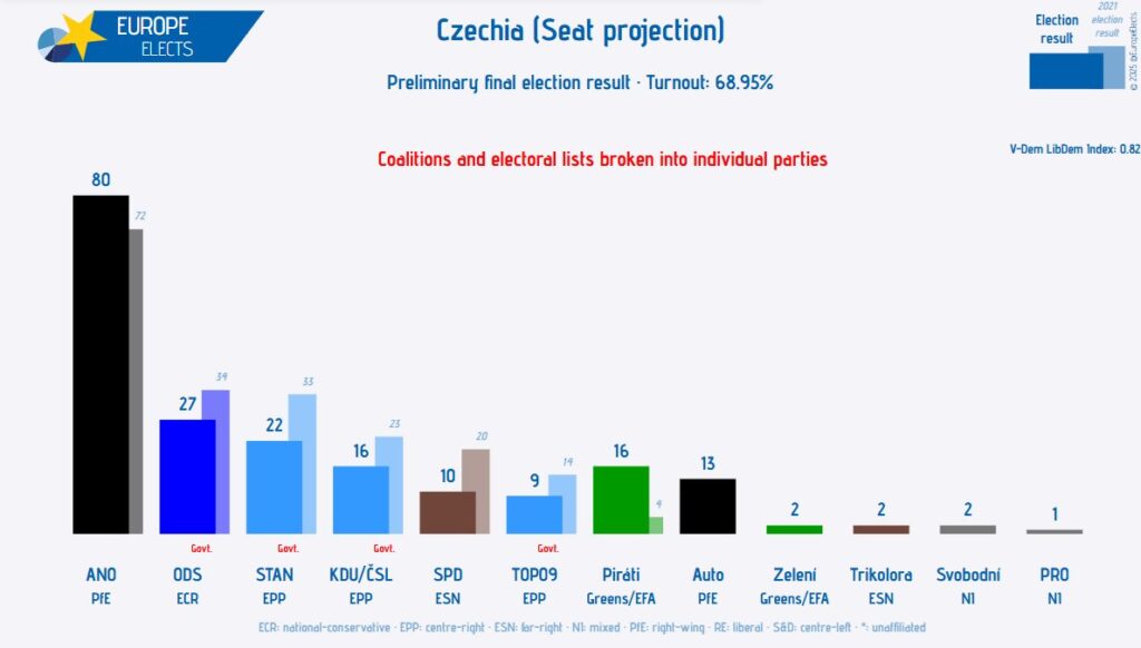 Í þessum kosningum töpuðu sitjandi forsætisráðherra Petr Fiala og Spolu bandalag hans verulega, með fækkun úr 71 sæti í um 50 sæti á þingi. Á grafinu að neðan sést skipting þingsæta á milli flokka: