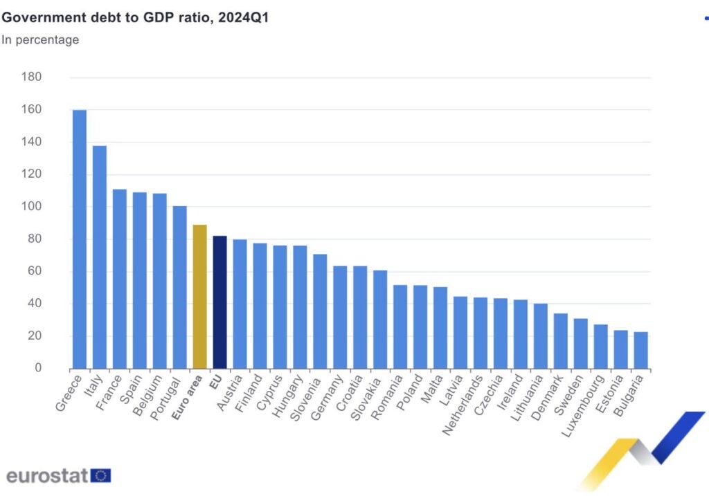 Samanlagðar ríkisskuldir aðildarríkja ESB námu 82% á fyrsta ársfjórðungi 2024, samanborið við 81,5% ársfjórðunginn á undan. Í aðildarríkjum evrusvæðisins er skuldirnar að meðaltali 88,7% sem er aukning frá 88,2% síðasta ársfjórðung 2023.