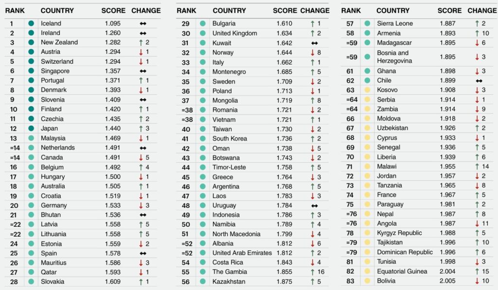 Ísland toppar listann fyrsta sæti eins og í fyrra. Írland er í öðru sæti. Í þriðja sæti er Nýja-Sjáland, sem hefur klifrað upp um tvö sæti. Rússland er neðst.