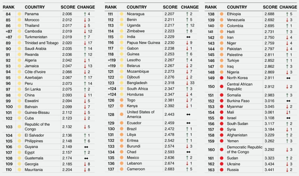 Eitt Evrópuland sker sig úr – Frakkland, sem er í 74. sæti af 163, þrátt fyrir að hafa færst upp um fimm sæti. Bandaríkin eru enn neðar (128).