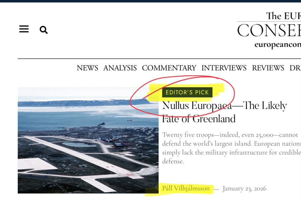 Greinin sem ritstjóri miðilsins hefur valið sérstaklega til birtingar fjallar um ásælni Evrópusambandsins í Grænland, Ísland og Noreg samkvæmt stækkunaráformum ESB til norðurs. Páll skrifar um heimsókn Ursulu von der Leyen til Íslands og ræður hennar í stíl við Rómarkeisara til forna. Vandamálið eins og Páll sér það, er bara að Evrópusambandið er ekkert stórveldi. Þegar ESB er að einangrast í austri og suðri, stefnir sambandið til norðurs en Donald Trump hefur eyðilagt þá áætlun með baráttu um nærveru Bandaríkjanna á Grænlandi.
