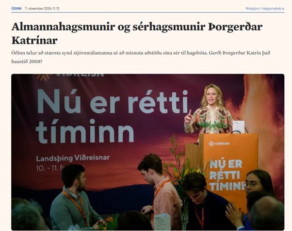 “Almannahagsmunir framar sérhagsmunum,“ eru kjörorð Viðreisnar. Sá íslenski stjórnmálamaður sem öðrum framar hefur haft sérhagsmuni framar almannahagsmunum er Þorgerður Katrín Gunnarsdóttir ÞKG, formaður Viðreisnar sem vill inn í Evrópusambandið. ÞKG er sú spilltasta í bransanum. Upphæðir spillingar ÞKG eru fordæmalausar og lygar þeim tengdar svívirðilegar. ÞKG nýtur sérstakrar verndar Djúpríkisins, gift Kristjáni Arasyni sem var eini starfsmaður Kaupþings sem fékk að færa hlutabréf og skuldir í einkahlutafélag 7Hægri ehf, að sögn Óðins Viðskiptablaðisins. Það var í mars 2008.