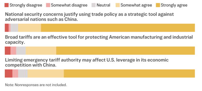 Þá sögðu 89 prósent að viðskiptahalli og ósanngjörn viðskiptahættir erlendra ríkja gætu talist neyðarástand sem réttlætti öflugar aðgerðir forseta. Meirihluti, 64 prósent, taldi að þingið ætti ekki að hafa meginvald til að leggja á víðtæka tolla og 68 prósent voru andvíg því að forseti þyrfti skýrt samþykki þings áður en nýir tollar yrðu settir á.