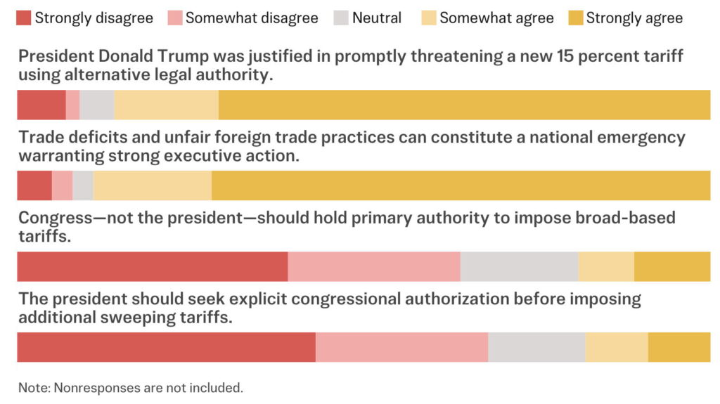 Í könnuninni sem framkvæmd var 25.–26. febrúar 2026 lýstu fjölmargir sig andvíga því að Hæstiréttur Bandaríkjanna hafi úrslitavald um tolla þegar um neyðarástand er að ræða. Spurt var hvernig skilgreina ætti heimildir forseta til að leggja á tolla í slíkum aðstæðum framvegis og voru svörin að mestu leyti hliðholl framkvæmdavaldinu.