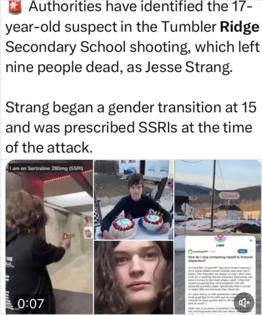 Tíu manns létust í skotárás í skóla í Tumbler Ridge í Bresku Kólumbíu í Kanada áður en fjöldamorðinginn tók sitt eigið líf. 25 manns særðust en ekki lífshættulega. Nokkrir fjölmiðlar greina núna frá því að 18 ára transkona að nafni Jesse Strang sé grunaður um að standa á bak við blóðbaðið. Fjölskyldan hefur staðfest, hver morðinginn er.