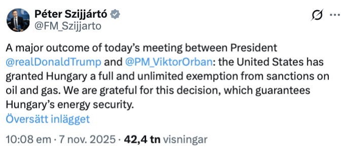 Bandaríski forsetinn hefur samþykkt undanþágu í eitt ár fyrir Ungverjaland. Samkvæmt ungverska utanríkisráðherranum Péter Szijjártó varðar það „algjöra og ótakmarkaða undanþágu frá viðskiptaþvingunum á olíu og gasi.“