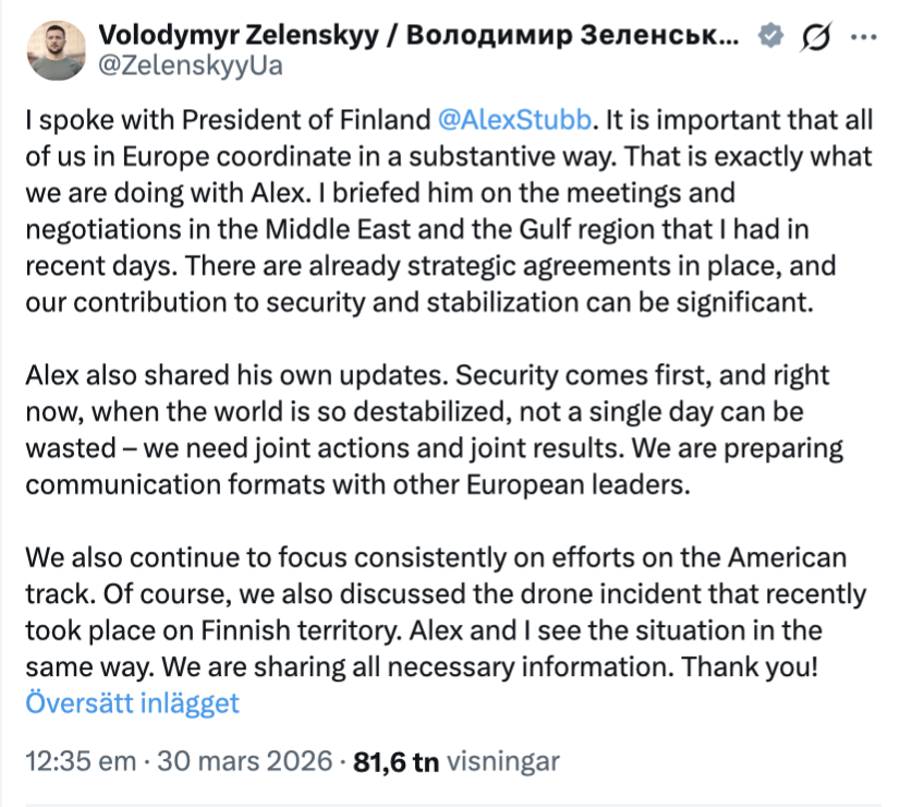 Í færslu á samfélagsmiðlum tilkynnti forseti Finnlands, Alexander Stubb, í fremur hófstilltu orðalagi að „einn drónanna“ hafi komið frá Úkraínu. Nokkrir miðlar, þar á meðal DN, hafa síðan haldið því fram að báðir drónarnir hafi verið frá Úkraínu.