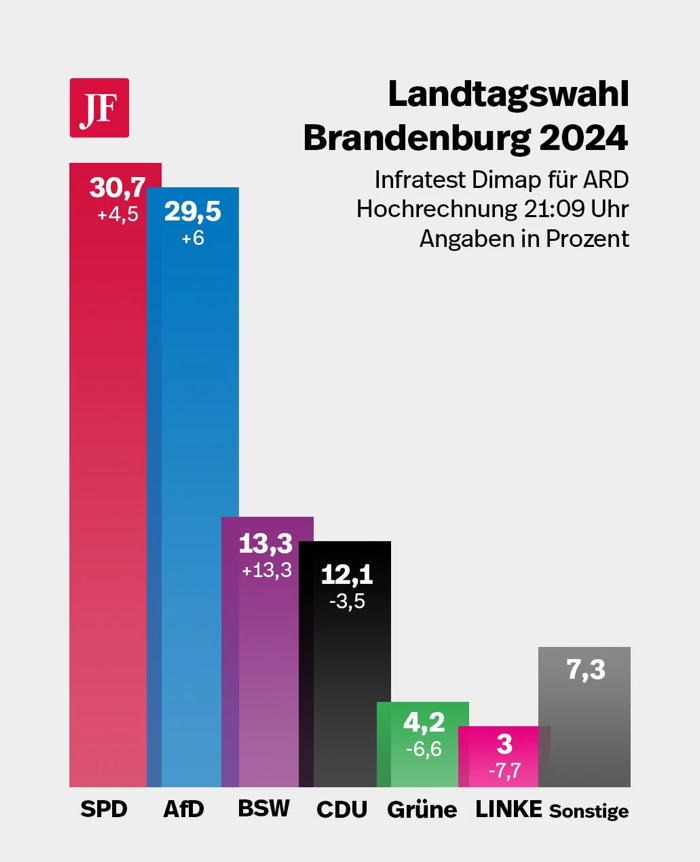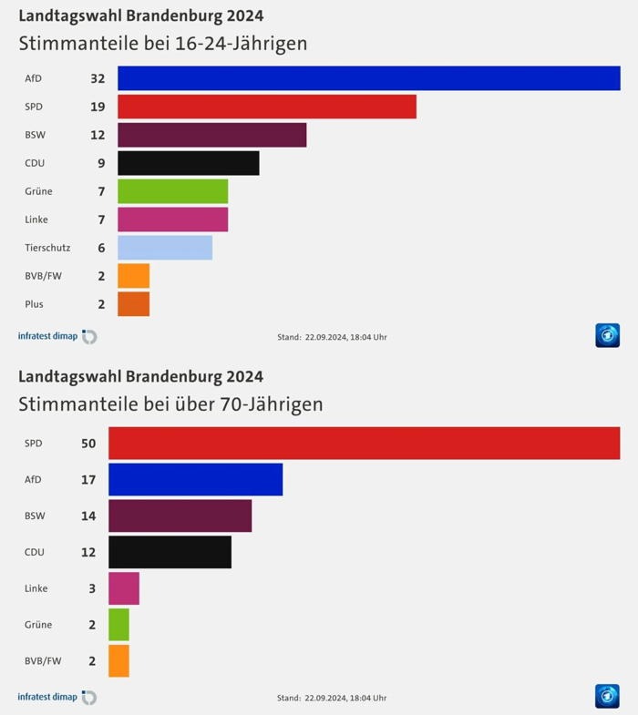 Útkoman er mikill sigur fyrir AfD sem bætir við sig 6%. Sósíaldemókratar bæta einnig við sig 4,5%. Samkvæmt Junge Freiheit sem hefur farið yfir tölurnar er Valkostur fyrir Þýskaland vinsælastur hjá unglingum 16-24 ára. Unglingar mega kjósa frá 16 ára aldri. Flokkurinn fær 32% fylgi í þessum aldurshópi á meðan sósíaldemókratar fá aðeins 19%. Dæmið lítur öðru vísi út hjá eldri kjósendum yfir 70 ára. Þar kjósa 50% sósíaldemókrata en AfD fær aðeins 17%. Í næstu kosningum mun því koma enn betur í ljós, að 34 ára valdaskeiði sósíaldemókrata er á enda í Brandenburg.