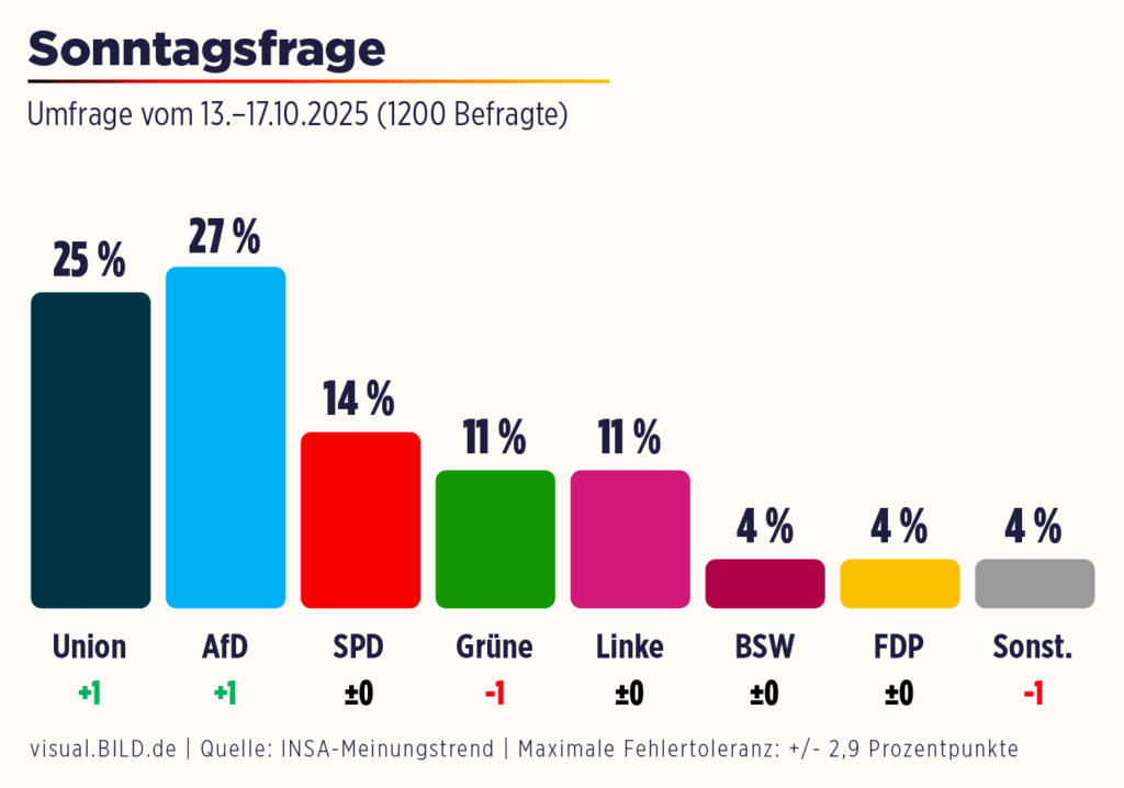 Í könnuninni fer AfD fram úr Kristilega demókrataflokknum, Sambandsflokknum (CDU/CSU), sem er enn með 25%. Ríkisstjórnarflokkarnir Sambandsflokkurinn og SPD fá samanlagt 39% sem dugir ekki fyrir eigin meirihluta.